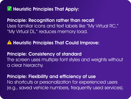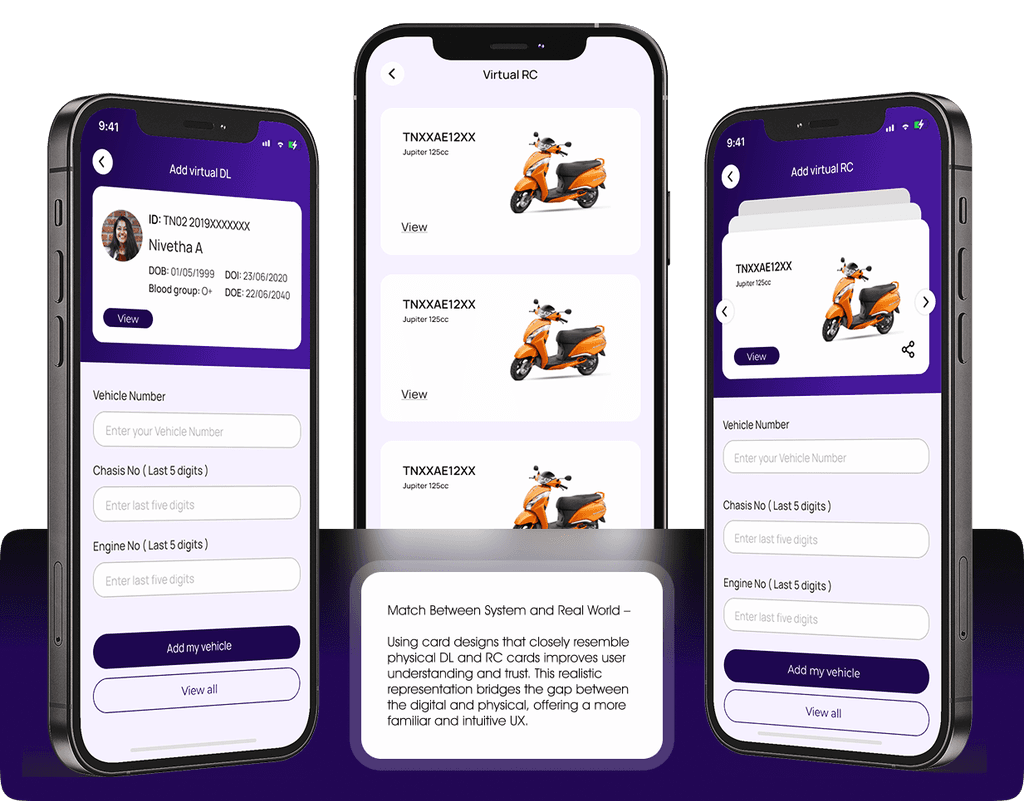 The new design integrates vehicle images and card-like layouts for RC and DL, mimicking real physical cards. This visual storytelling builds immediate recognition, trust, and ease of use.
