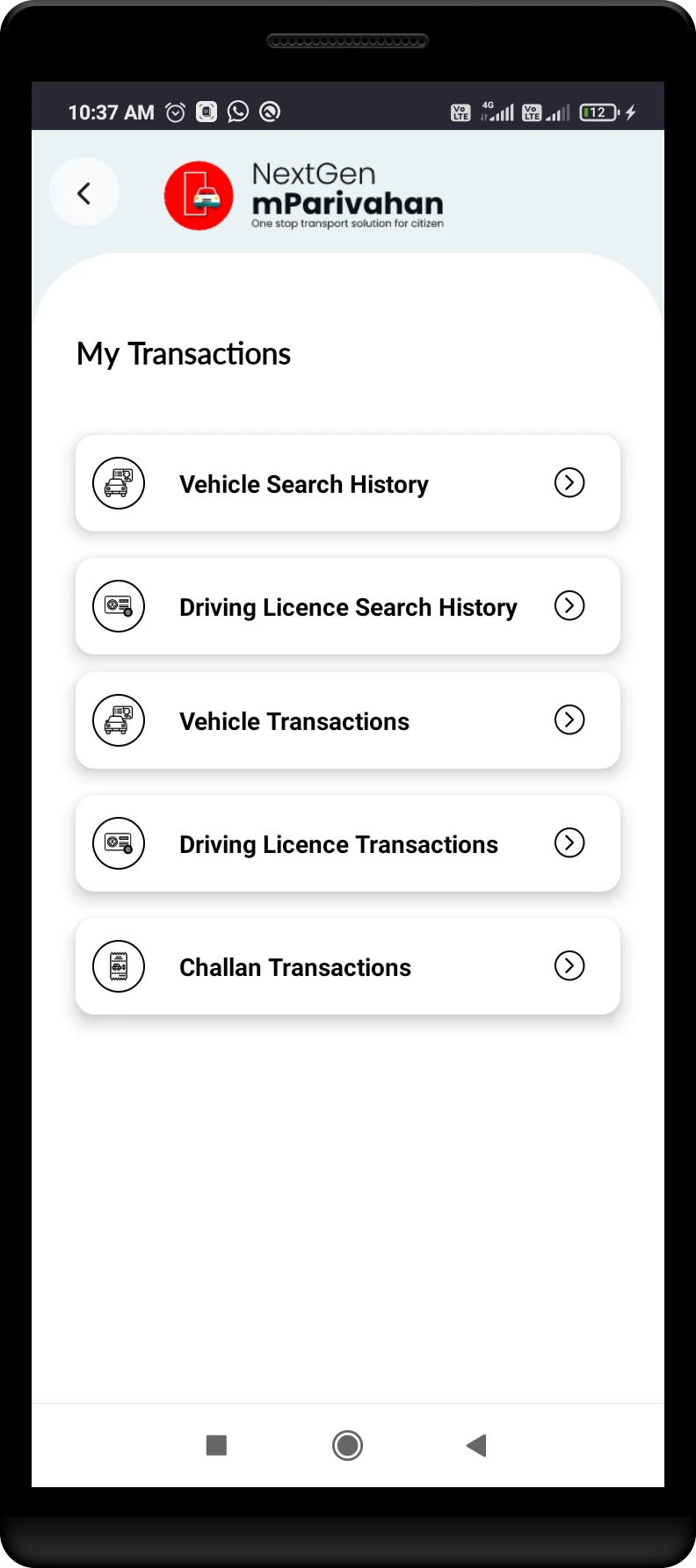 This bold and modern color choice gives mParivahan a trustworthy and sophisticated feel. It enhances user experience with a clean, high-contrast design, making the app stand out from traditional government platforms.